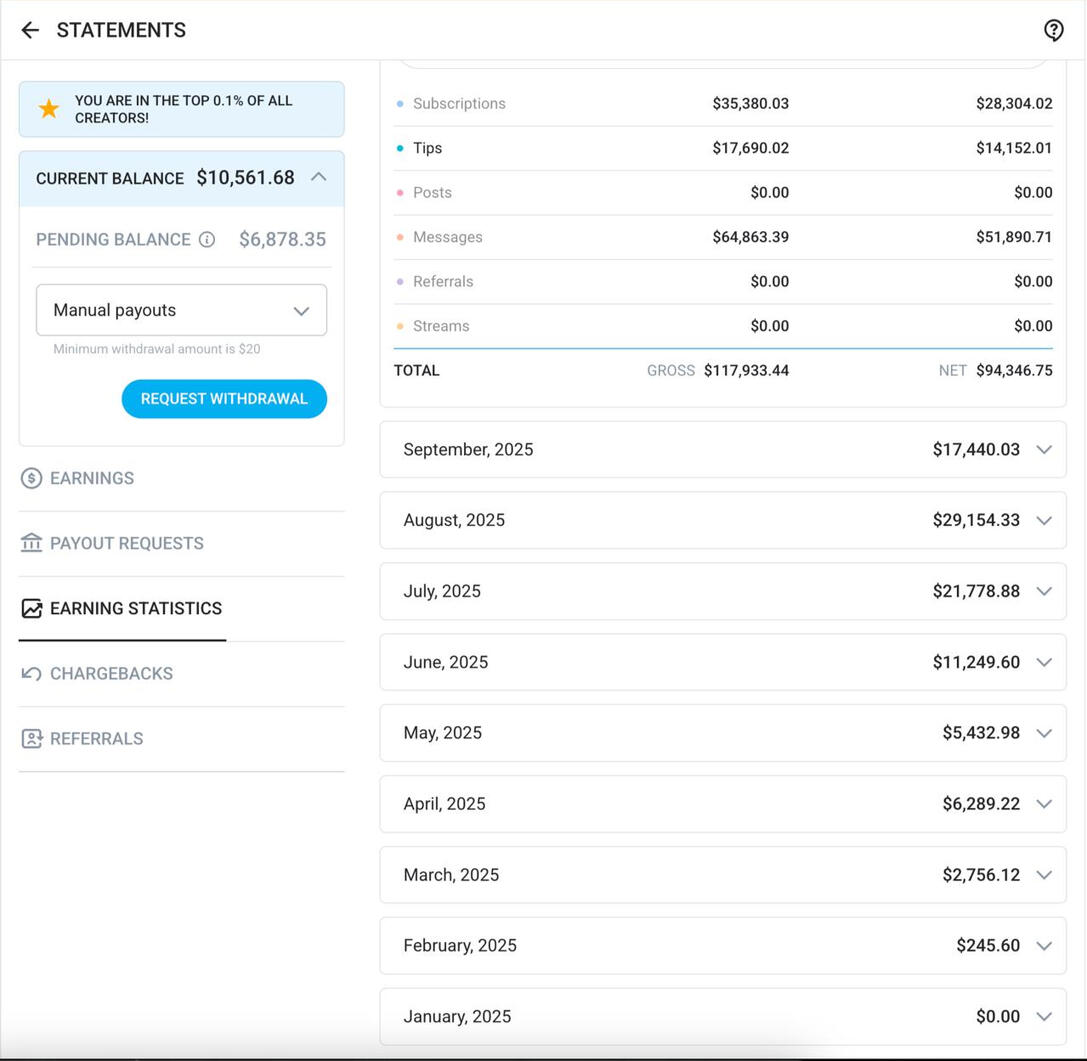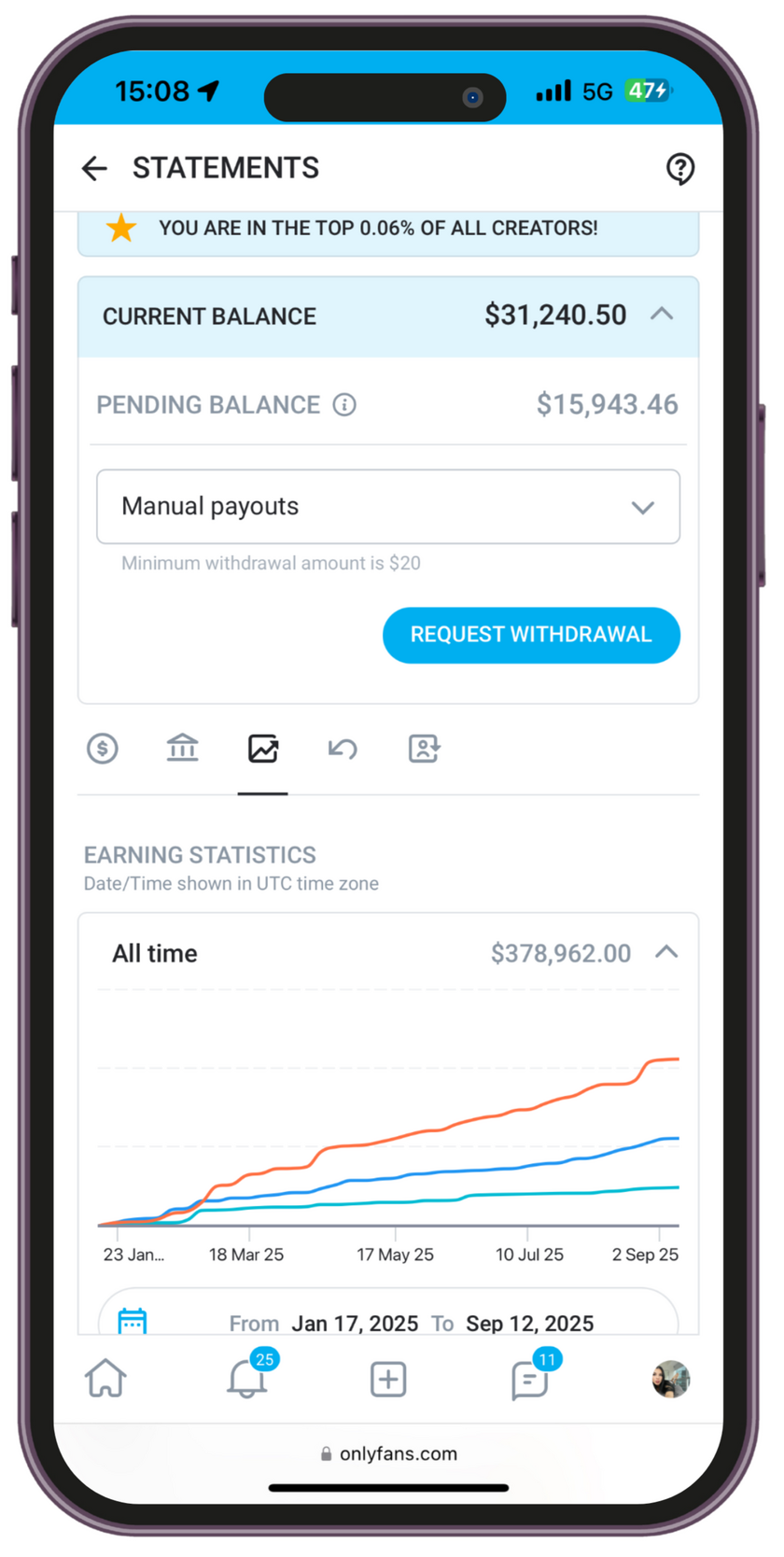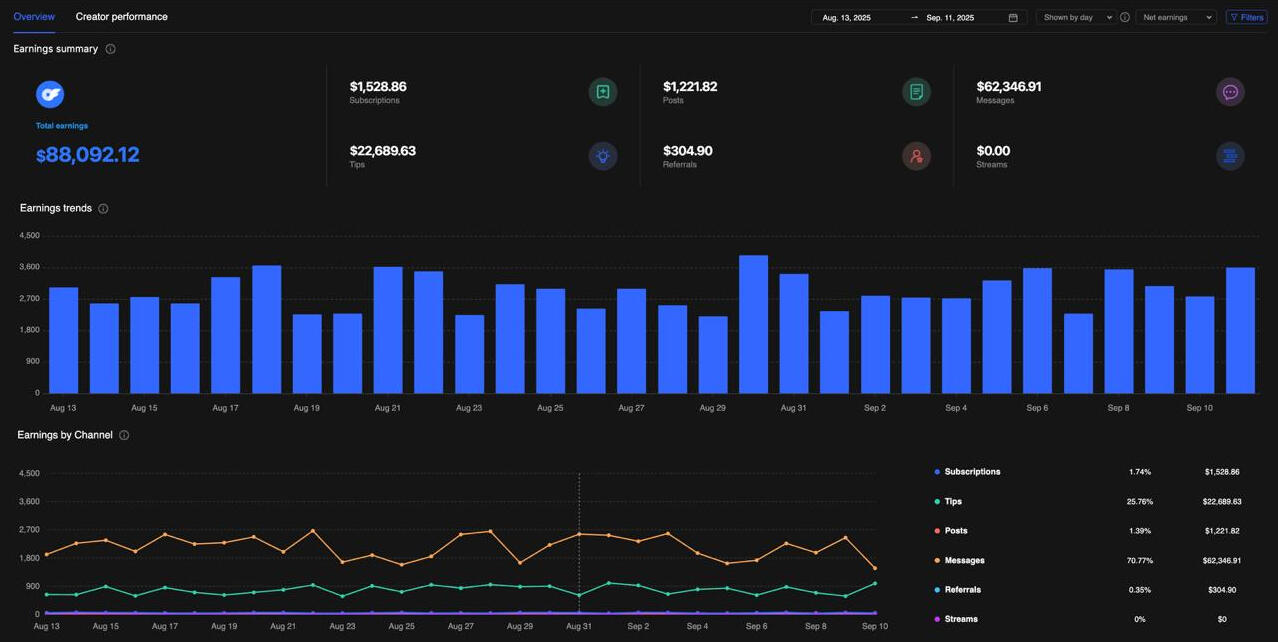 If you’re already active on OnlyFans, you can usually see a noticeable boost within 2-3 weeks. New creators often begin earning in their first month, typically between $1,000 and $7,000. With consistent creativity and our ongoing support, your revenue and audience grow steadily - with many creators aiming for around $20,000 in monthly revenue by the third month.